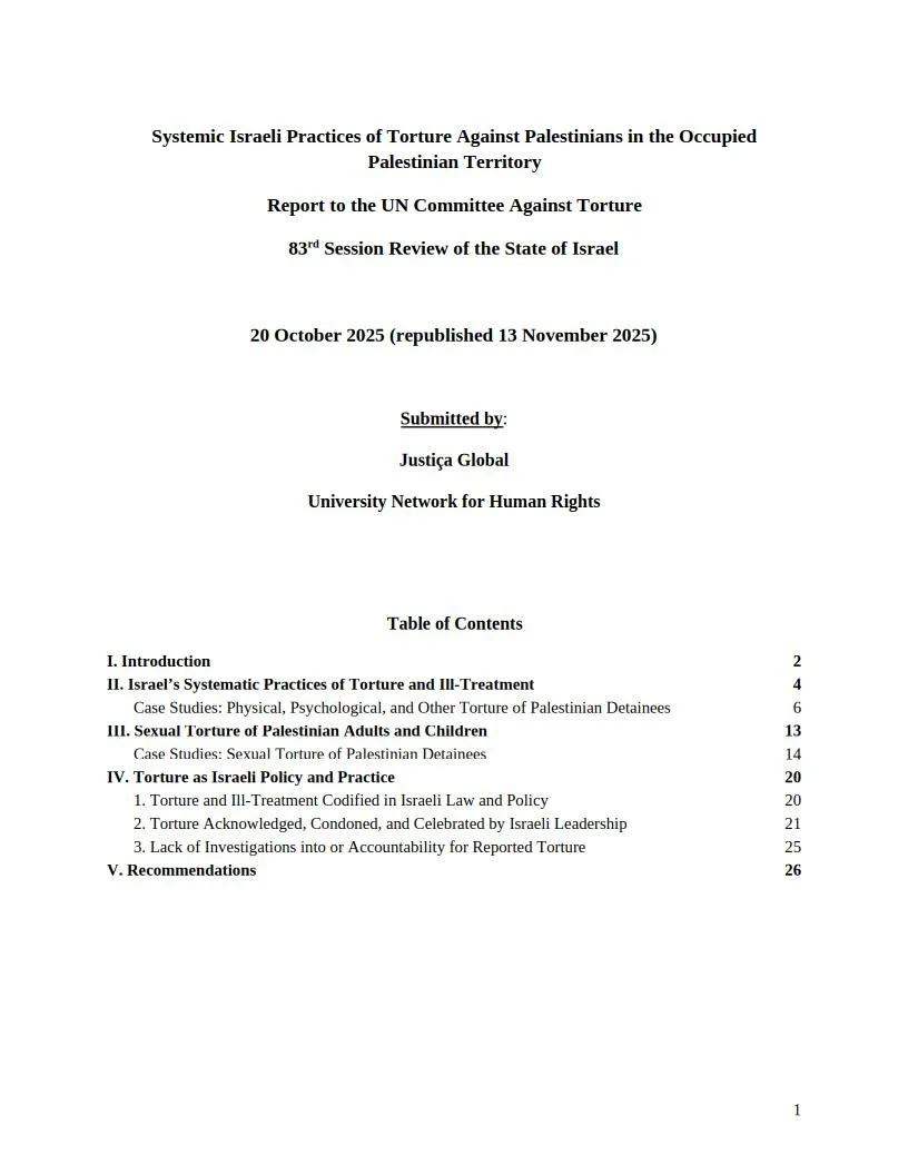 Report to the UN Committee Against Torture: Systemic Israeli Practices of Torture Against Palestinians in the Occupied Palestinian Territory